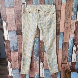 Free People Aztec Print Skinny Jeans. Women's size 25. Pre-owned in excellent condition. Tan/blue Aztec print. 5 pocket design. Zipper at ankle.