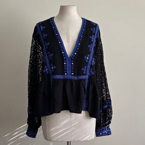 Free People BOOGIE ALL NIGHT Balloon LACE Blouse Post Sleeve sz MEDIUM
