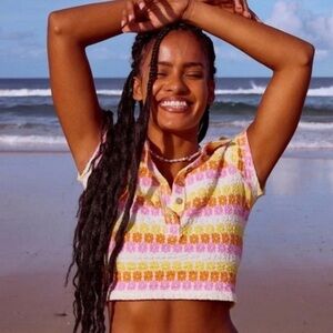 Free People Babe Town Polo Shirt Floral Spring Hippie
