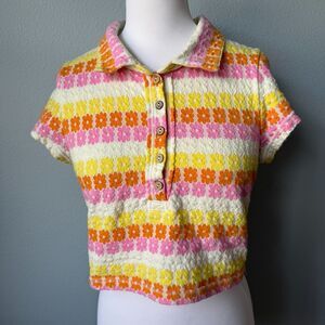 The ideal retro-inspired top featured in the perfect cropped, polo silhouette with defined floral printing throughout for added dimension.