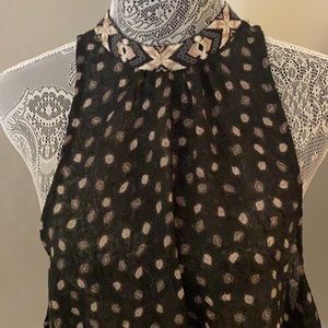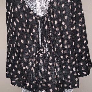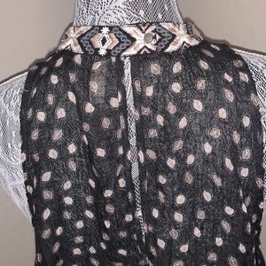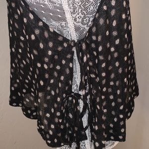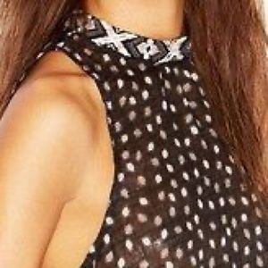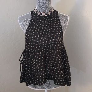 Colors are black, white/cream and blush. High neckline with button snap. Open back detailing. Sides are open with ties. Flowy fit.
