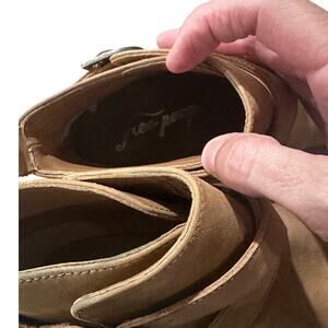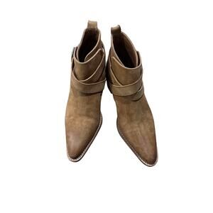The boots feature a pointed toe, an adjustable buckle strap, and a distressed woodgrain heel. They are made of genuine leather and have a lined, cushioned insole. Pair with skinny jeans for a laid-back look or with a mini dress for a night out. Very good condition with some minor scuffing on the front. See pics for details. Retail $168.