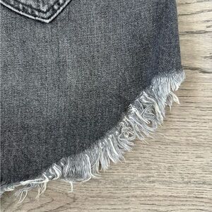Washed denim mini skirt featuring a statement raw fringe hem.