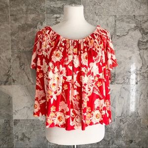 A printed exterior, back cutout, and cold shoulders complete this casual t-shirt.