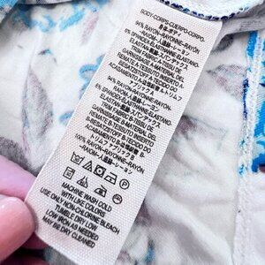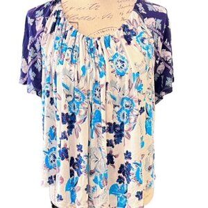 Super cute floral top with cold shoulders and flutter sleeves, tie neck on back and a backless style. High-low hemline. Very flowy.