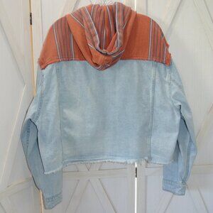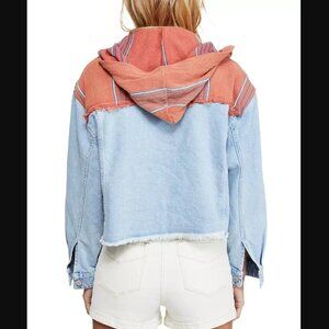 Free People gives a boho-chic vibe to this hooded denim jacket with a frayed hem and contrasting print at the yoke.