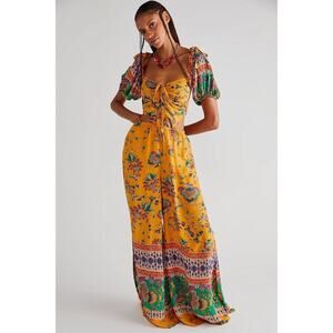 Free People Bali Citrus Skies Jumpsuit – Size L– Ruched Bodice, Cutouts,