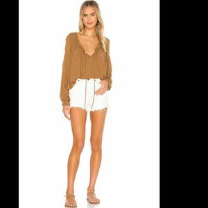 Free People Banda Blouse Top Brownish Gold Boho Oversized Smocked Cuffs NWT-inside label marked to prevent return to retail store Retail $98 Soft and comfortable fabric Split neckline with drawstring closure and ruffle trim. Elastic balloon sleeves and smocked cuff detail. Gauze fabric.