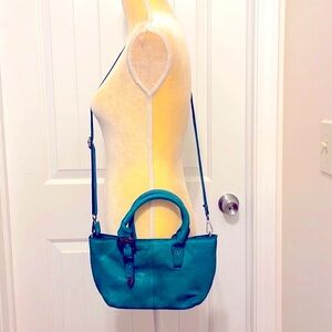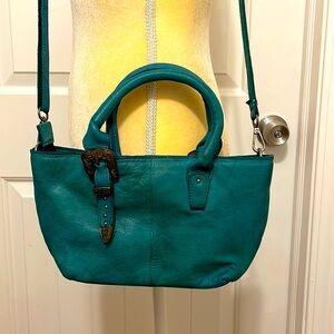 Features: Structured style, leather fabrication, top handles, adjustable and detachable crossbody strap, Western buckle detail, zipper closure, interior zipper pocket