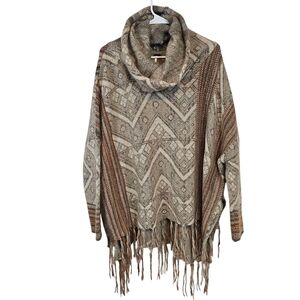 Free People Be The One Poncho Cowl Neck Aztec Southwestern Fringe Sweater