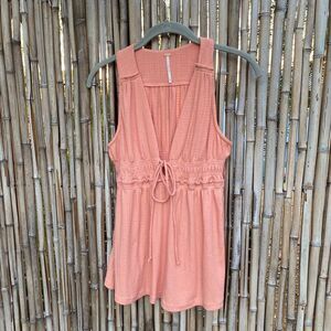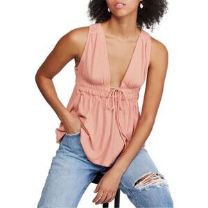 A plunging neckline updates a swingy tank with a racerback and slim ties under the bust.