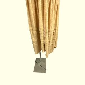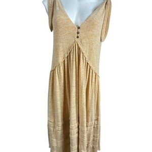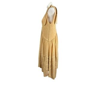 Step out in style with this elegant mustard tie at the shoulder dress. Lightweight and soft texture in a Dijon mustard color, maxi dress from our Free People Beach Collection with a V-neck line, three coconut buttons closure, pull over design, tie on the shoulders, raw him ruffle on the waist line with pleading, with bands going around the bottom, half, handkerchief, hem line, Size extra small approximate measurements armpit to armpit 18 inches length 51 inches waist 17 inches