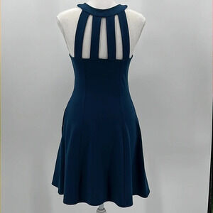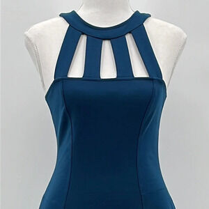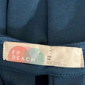 Free People Beach Cage Halter Dress in Teal - Size XS. Great pre-owned condition. Very minor signs of wear, pilling. Model pic is included to show fit only. See actual product photos for color. Halter style neckline with cage cutouts, knit fabric, popover style, fit and flare, mini, in seam pockets on both sides of skirt section. Approximate measurements: 14" bust, 12" waist, 34" length from top of shoulder strap.