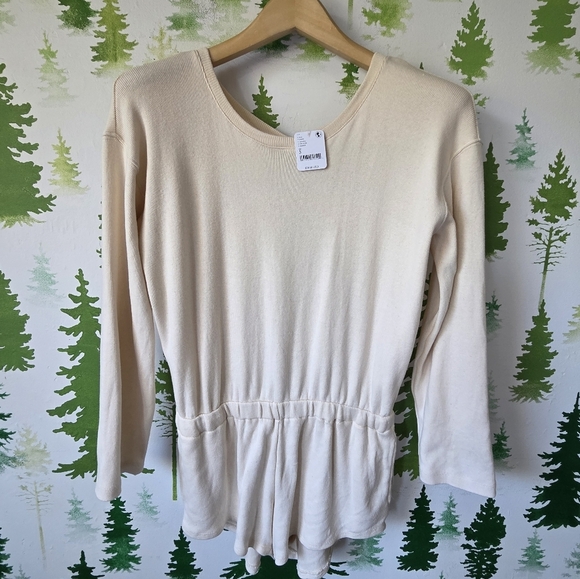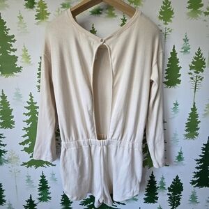 This romper is part of the FP Beach collection and features a relaxed, boat-neck silhouette with a banded waistband and a keyhole open back. It is a long-sleeve sweater romper with a cinched elastic waist that gives the appearance of a two-piece set.