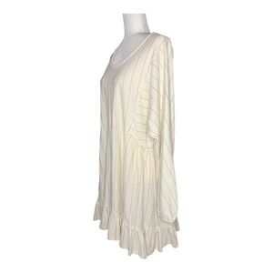 Free People April Cream Striped Ruffled Long Sleeve Mini Dress! Lightweight textured cotton-blend stretch-woven fabric, with black pinstripes throughout, shapes this breezy dress that has a rounded neckline and long dolman sleeves with elastic cuffs. Raw seamed detailing accents the oversized silhouette before ending at a ruffled mini hem.
