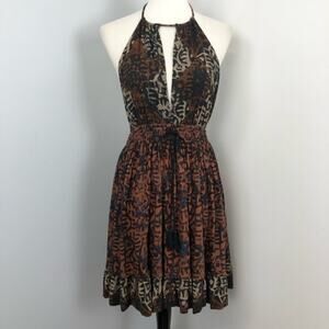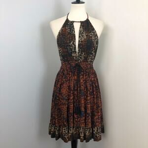 Details An artistic print takes center stage on this swingy halter mini dress.