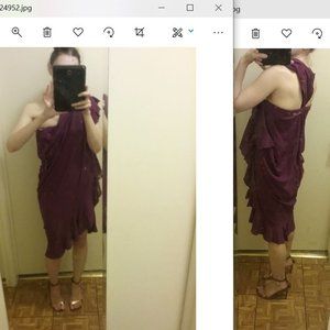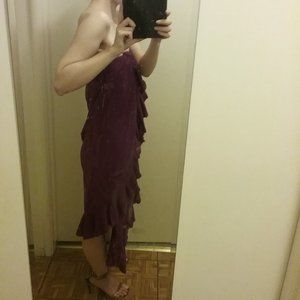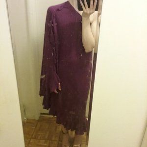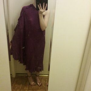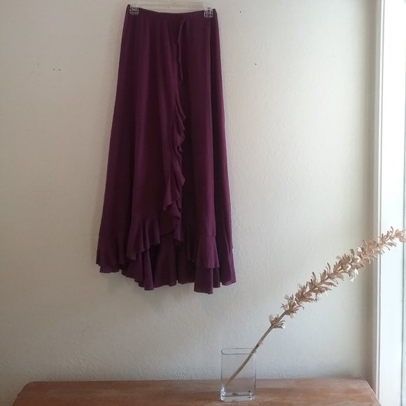 Magenta purple maxi skirt/dress. Faux wrap front with raw edged cascading ruffle & flouncy ruffled hem. Textured cotton blend. Convertible: intended to be worn as maxi skirt or dress. Gently preloved in VGUC, no tears, stains etc.