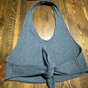Stylish gray ribbed knit halter top with a back tie detail. Perfect for casual outings.