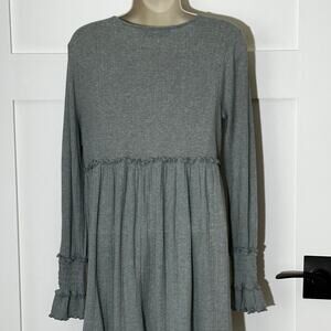 Breezy ribbed mini dress featured in an A-line silhouette with long sleeves accented with smocked and ruffled details.