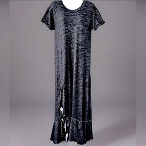 Tee-shirt maxi dress (from Beach Free-est collection) w a high-low silhouette & distressed, wide, super ruffled slit hem; short rolled sleeves & round scoop neck. There are slit hip pockets, which I didn’t even know about at first- I didn’t take pics of those! Reviews say this runs large and it is EXTRA long- I got it for myself but it is way too long for me (I’m 5”1’); this hasn’t been worn ever, only tried on over clothing.