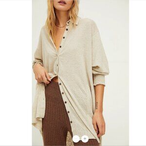 Idea for a layered look or styled solo, this effortless mini dress from Free People Beach collection is featured in a classic button-down silhouette with exaggerated sleeves and lower back hem for added dimension.