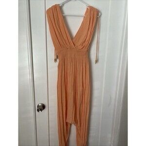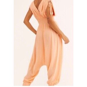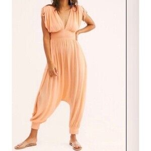Deep V-neck hair and pant jumpsuit perfect for the beach or yoga or vacation! The waist stretches a lot and goes up to 30 inches, this extra small will definitely fit a small since free people does run quite large. See photos for complete details and dimensions no visible flaws.