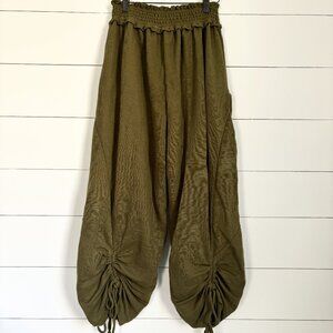 Free People Beach olive green parachute balloon style pants. These are such cute pants on. They have an elastic waist and pockets. They have mulitple ties at the pockets and ankles. There is also a cinch/ruching detail at the ankle. These are in excellent like new condition. Tagged an XS but are oversized and a S/M as well.
