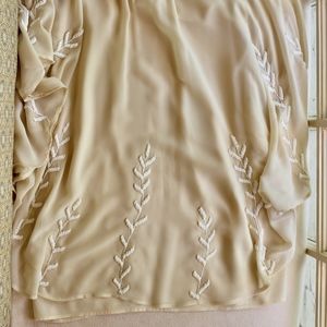 A beautiful dress with beaded chiffon overlay that opens in the back to let you move the flutter sleeves freely as if they were wings.