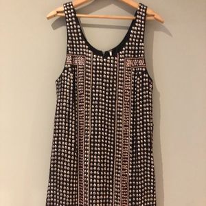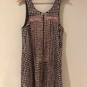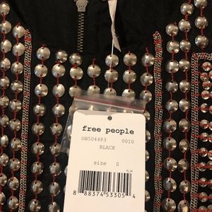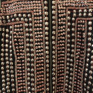 100% rayon fully lined. Dress is black with silver beading and red stitching, exposed silver zipper on back