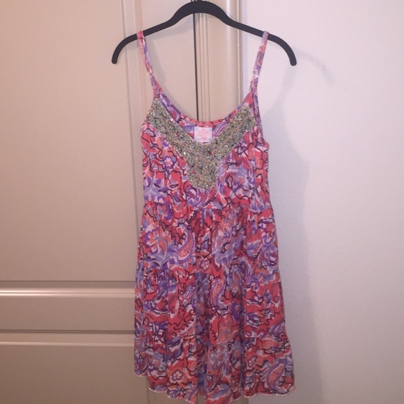 Gently worn, in great condition! Size S (the size is not on the dress but that's what size was on the original tag) flower design with beautiful beading on the front. Adjustable drawstring in the back. Adjustable straps. Perfect with a jean jacket!