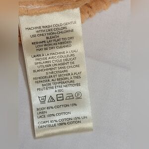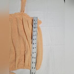 New Without Tags Free People Because of You Blousen Tank Top Size Large. Color peach. Billowy tank with soft 85% cotton 15% linen blend, lightweight design, scalloped eyelet trim, drawstring hem, square neckline, shoulder straps have a 3 button size adjustment, cropped.