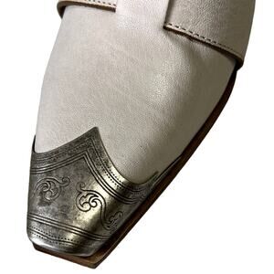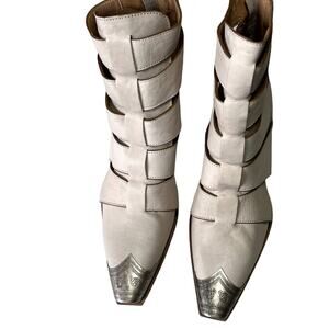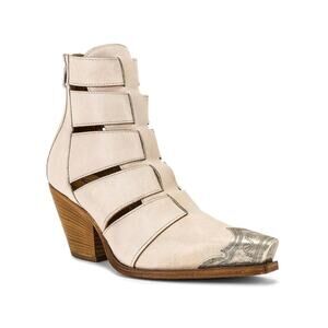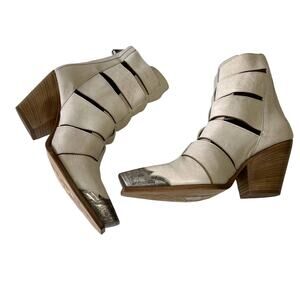 Chic ankle boots with strap design. Beige leather and metallic toe caps. Ideal for stylish outings.