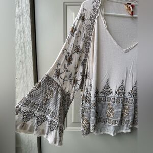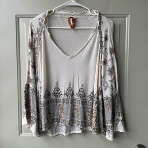 Free People Bell Sleeve Pullover Top Shirt PInk Gold Women's Sz M India Motif