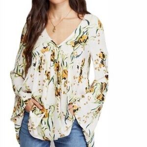 Free People Bella Printed Floral Blouse in Porcelain Large Bell Sleeve V-Neck