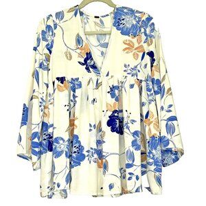 DESCRIPTION The Bella Printed Tunic Dress is an ivory, trumpet sleeve, flowy dress in a lovely blue floral print. Plunge neckline, empire waist, babydoll style with flowing sleeves. Rayon. Machine wash cold, hang to dry.