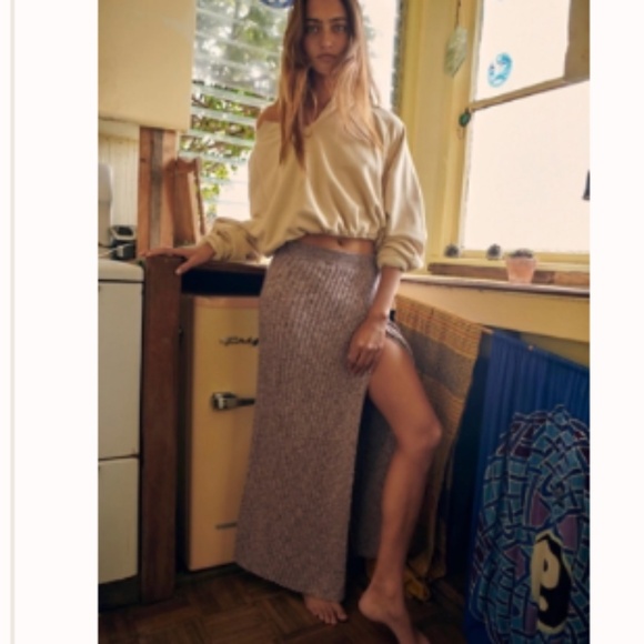 From Free People. Large Side slit "better days midi skirt" in Plum Jam- Heathered Purple look. Stretchy waistband. It's called a midi, but it's a maxi skirt.