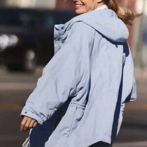 Features: Zip and button-front closure; hooded design; collared neckline; multiple pockets; adjustable sleeve cuffs; cinch-able waistline