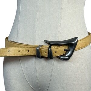 Elevate your style with this chic yellow leather belt featuring a striking silver buckle. Perfect for adding a pop of color to any outfit.