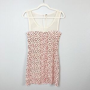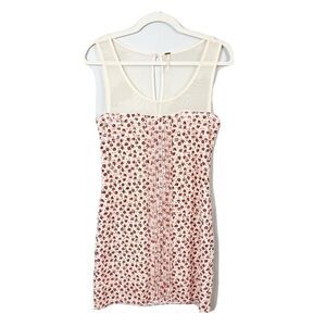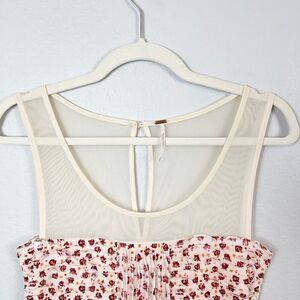 FREE PEOPLE Sleeveless Sheer Front Dress Size Small. Beautiful wide neck dress with a sheer cream colored chest with a floral print design. This is a fully lined dress and the material does have some stretchy give to it with a undefined waist. This is in excellent pre owned condition with no flaws.