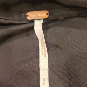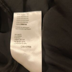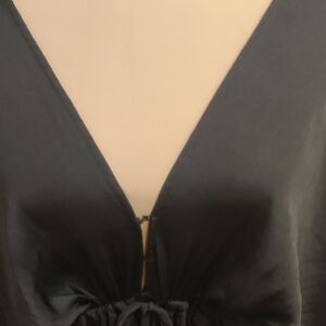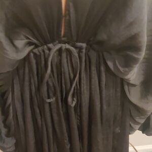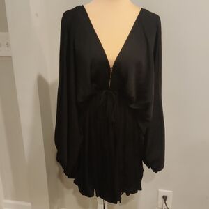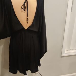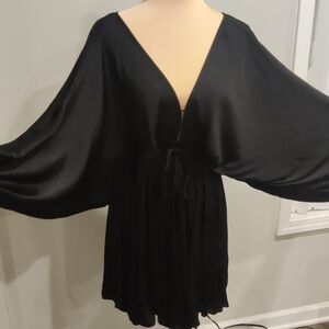 Chic black dress with a deep V-neck. Features flowing sleeves and backless design. Perfect for stylish outings.