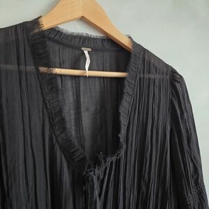 Free People Black Button Front Sheer Mesh Raw Trim Top Size M Long Sleeve