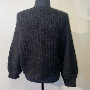 This Free People sweater is a black cable-knit style with a fuzzy texture, perfect for a cozy and stylish look. It features long sleeves, a crew neck, and is made from 100% cotton fabric, ensuring comfort and warmth. The size is XS and the sweater has a pullover style, embodying a trendy 90s theme. Perfect for women looking for a chic and comfortable addition to their wardrobe.