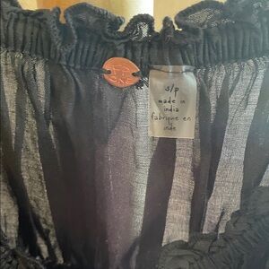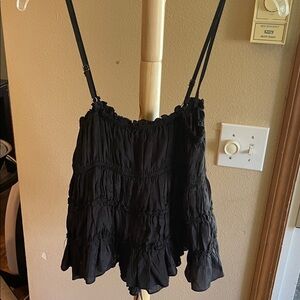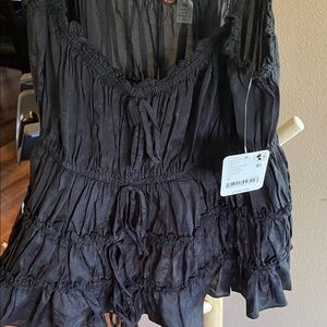 Stylish black camisole by Free People. Features ruffled tiers and adjustable straps. Perfect for layering or wearing alone.