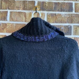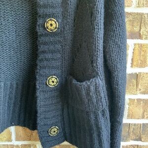 Stylish black cardigan with blue trim. Features cable knit and button front. Perfect for layering.
