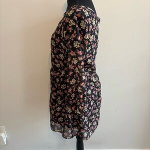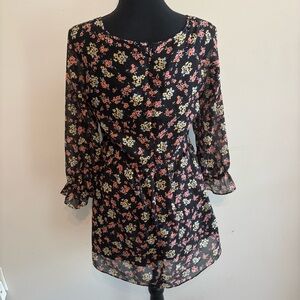 Free People Black Comb Ditsy Floral 3/4 Sleeve Ruched Babydoll Mini Dress Tunic