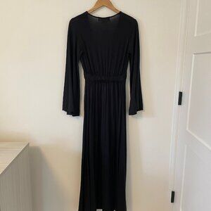 New, never worn, low cut v-neck maxi dress/caftan. Intended as a beach coverup as neckline is cut almost to the waist. 100% cotton. Size X-Small, but runs big. Extra long bell sleeves.