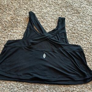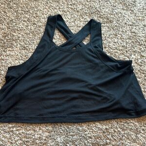 Stylish black crop top. Features a racerback criss cross design. Perfect for casual wear.