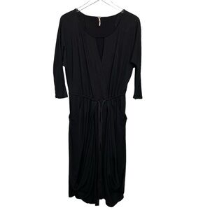 This chic black dress by Free People is designed for a night out or a comfy night in, featuring a striking plunge neckline with a cut-out detail. The 3/4 dolman sleeves and drawstring front accentuate the sheath silhouette, while the pleated design adds a touch of elegance. Front pockets add comfort. Perfect for cocktail occasions, this dress combines style and sophistication effortlessly.