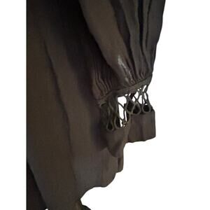 Black mini dress featuring intricate crochet cutouts, a deep V neckline, and a flirty open back. Lightweight rayon blend with lace detailing at the cuffs and waist, this dress is romantic, flattering, and festival-ready. Long sleeves with button cuffs and loop button bodice add charm. Size 4, fits like a Small.