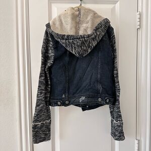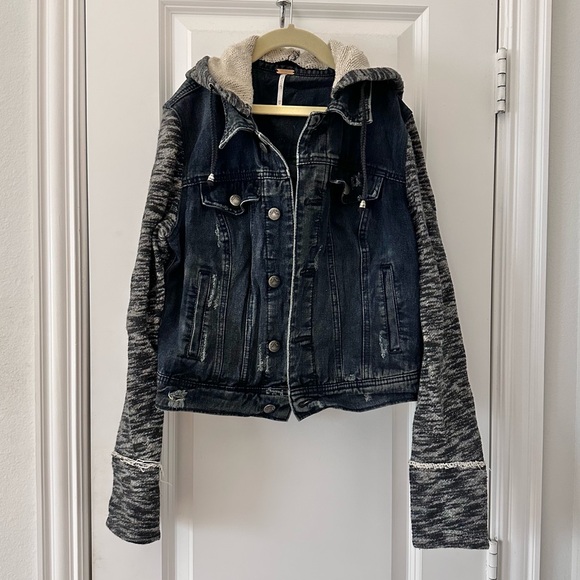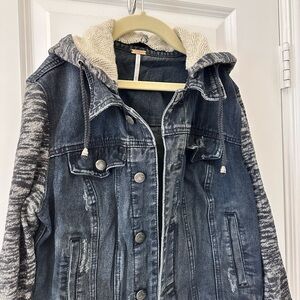 Free People black denim jacket featuring cozy gray sweatshirt sleeves and hood